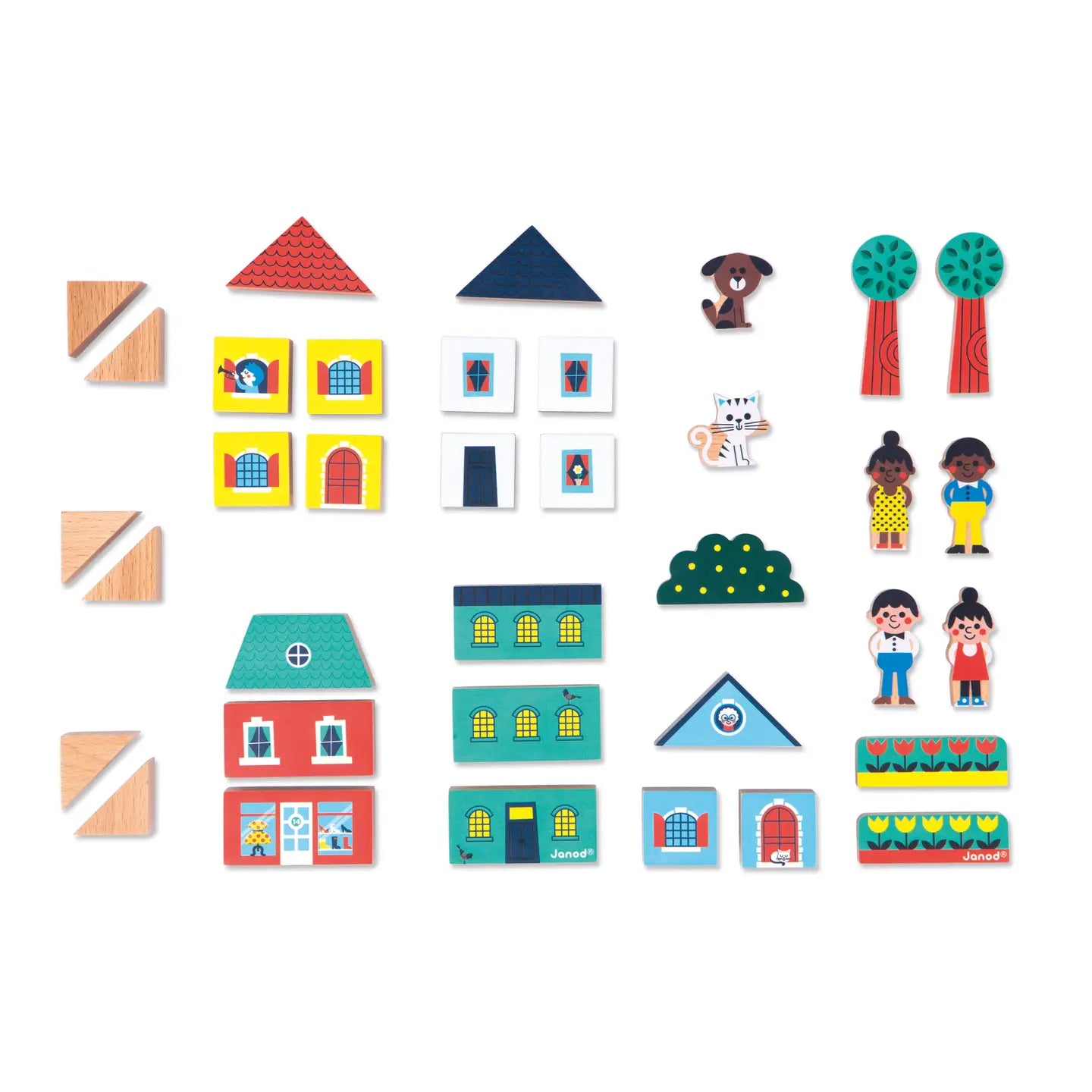 A one or two-story house? A colored. pitched or flat roof? This set of 38 solid wood pieces is ideal for planning and building little one's dream city. It includes 27 building blocks. 5 decorative elements and 4 characters. The clever storage box with its sliding lid can be used to store all the pieces like a puzzle. Simply follow the diagram on the bottom of the box. The ideal toy for developing imagination. Wooden construction toy for children ages 2 and up. Combine this set of blocks with a mat and cute vehicles in the same Janod range to perfectly complete the universe.
